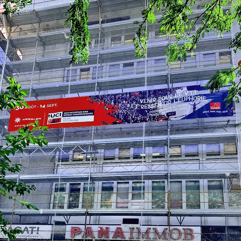Que ce soit une banderole publicitaire en PVC classique ou une version micro-perforée (PVC Mesh) idéale pour vos façades,